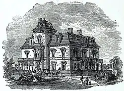 One of Newport's oldest mansions, Beaulieu was originally built in 1859 by the Peruvian merchant, Federico Barreda, who made his money in the 1850s guano trade.[lower-alpha 1] [3] Beaulieu was designed for Barreda by New York architect Calvert Vaux, who also designed the bridges in New York's Central Park.[4] In July 1859, Barreda paid $24,000 for about nine acres on the Bellevue Avenue hill overlooking Narrangansett Bay. He then hired Vaux for a five percent fee on a construction budget of $100,000. Eventually he went over his budget, and spent at least $26,000 more on furnishings and interior decoration. This seasonal "cottage" had sixteen bedrooms, a library, billiard room, a wide surrounding veranda and ample quarters for housekeepers, nannies and cooking staff.