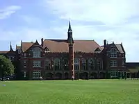 The Main School Building, originally built in 1891, is a Gothic Revival Grade II listed building.[16][17] On the night of 3–4 March 1979, much of the building was gutted by fire as a result of arson. The internal structure of the building was destroyed and thirty classrooms were lost. Almost all pupil records were saved but books, furniture and the large collection of portraits of former headmasters were lost. Nevertheless, the school was in full operation on Monday 5 March.[18][19]
