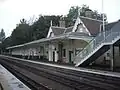 The original station building, which was little more than a cottage, was replaced in 1847 with the substantially larger white brick building with ashlar trimmings which still exists. This is notable for its carved bargeboards, some remaining diagonal paned windows and the pseudo-heraldic shields with 'MR' and '1847'.[8] The wooden platform canopies and adjacent wrought-iron and glass canopy were installed in 1871. The wooden platform canopies were originally located at Southwell railway station, and were relocated to Beeston when Southwell was rebuilt.[9]