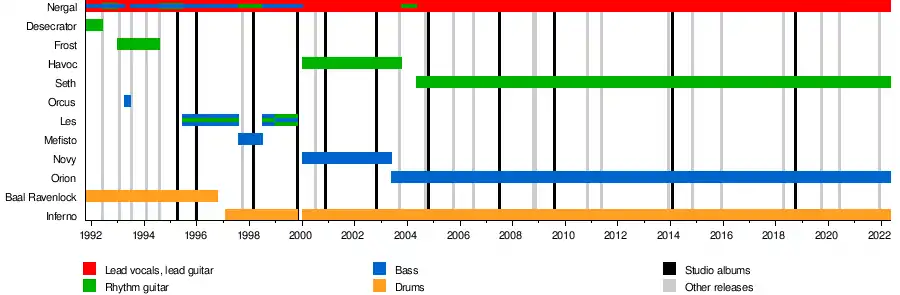 Until the late 1990s, the band played a traditional black metal style with heathen lyrical content, but soon changed to that of occult and thelemic themes written by their lead vocalist Nergal and Krzysztof Azarewicz. With the 1999 release of Satanica, the band demonstrated their presence in the death metal scene, while retaining their own signature style characterized by the drum work of Inferno and multi-layered vocals. Despite Behemoth having been labeled as death metal or thrash metal-influenced, Nergal has mentioned that he does not like the band to be labeled.[3][4]