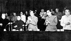 Bourgeois right appeared in most of Mao's speeches during Beidaihe Conference, but much of his thinking was summarized in Zhang Chunqiao's article.[37] Ke Qingshi, who was present at the conference, had read out to Zhang, the propaganda minister of Shanghai Municipal Committee, over the telephone his notes of Mao's thoughts on bourgeois right.[38] Later Zhang wrote the article named "Eradicate the Ideology of Bourgeois Right"[39] (also translated as "Do Away with the Ideology of Bourgeois Right";[40] Chinese: 破除资产阶级法权思想) which was highly regarded by Mao. On October 13, the People's Daily republished the article under Mao's order and added an "editor's note" written by Mao.[41] Mao's address in Beidaihe Conference, by and large, reflected the origin bourgeois right in the context of the Great Leap Forward.[42] From then on, the term "bourgeois rights," which originated from Marx's Critique of the Gotha Programme, provoked extensive discussion in China.[43]