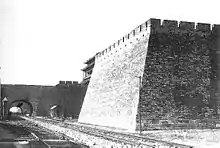 During the Ming and Qing dynasties, the principal defensive weapons were firelocks, cannons, and bows and arrows. In 1629, Houjin troops attacked Beijing, and in 1644, Li Zicheng's troops laid siege to Beijing. Troops atop the city walls used cannons extensively during both sieges.[8] During the Second Opium War (1856–1860), invading troops stationed outside the city walls gave up, because Beijing was too extensively protected. They then went on to burn down Yuanmingyuan and attack Haidian to the northwest. Between 13 August and 15 August 1900, when the Eight-Nation Alliance invaded Beijing, the fortifications withstood bombardment by cannon attacks for two full days before being overrun. The Qing forces took full advantage of their higher elevation and the protection of the thick walls to shoot Alliance troops. Russian and Japanese forces attempted several times to use nitrocellulose to blow a gap in the wall at Dongzhimen and Chaoyangmen, but failed, because every time a soldier tried to light the fuse, he would be shot.[9] The barbicans, enemy sight towers, and corner guard towers proved to be quite effective at deterring enemy attacks. For example, on the night of 13 August, Russian troops succeeded in invading Dongbianmen's watchtower, but suffered heavy casualties in the barbican. It wasn't until the late morning of 14 August that they conquered the gate tower at Dongbianmen, a mere 50 metres (160 ft) away.[10] Even after the Outer City and Inner City fell to Alliance forces, the Imperial city's defenses still held. On the morning of 15 August, American forces used several guns to try to destroy the Tiananmen gates, but they held. Japanese troops used ladders to scale the wall and open the gates, thus allowing Alliance troops into the Imperial city.[10] In an incident on 25 July 1937, a battalion of Japanese troops camped at Fengtai District, declaring that they intended "to protect Japanese immigrants" and "to protect Dongjiaomin Street's Embassy district", tried to advance into Beijing. When they began entering Guang'anmen, around twenty Chinese soldiers fired on them from atop the gate tower, forcing them to abandon their plan. Thus even in the modern era of the 1930s and 1940s, the dilapidated fortifications were still useful defensively.