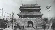 Yongdingmen (永定門 lit. 'Gate of Eternal Stability') was located on the midsection of the southern wall. It was built in 1766, imitating the multi-eaved Xieshanding style of the Inner city gates, roofed with grey tiles with glazed green rims. The gate had two floors, each five rooms by three rooms and 24 metres by 10.5 metres. The gate was 26 metres high. The watchtower was small in scale: three rooms by one room, 12.8 metres by 6.7 metres, in the single-eaved Xieshanding style with grey roof tiles. It had two levels of arrow slits, with seven on each level on the southern face and three on each level on the eastern and western sides. A single archway was positioned directly under the watchtower platform. The gate had a rectangular barbican measuring 42 metres from east to west and 36 metres from north to south. The corners of the barbican were curved. During the Boxer Rebellion, on 11 June, the secretary of the Japanese legation, Sugiyama Akira (杉山 彬), was attacked and killed by the Muslim soldiers of General Dong Fuxiang near Yongdingmen, who were guarding the southern part of the Beijing walled city.[20] The barbican was dismantled in 1950, and the gate tower and watchtower were dismantled in 1957. In 2004, the gate tower was reconstructed slightly north of its original location.