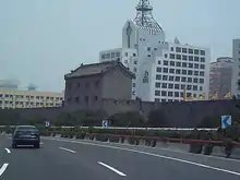 Dongzhimen (東直門 lit. 'Eastern Upright Gate') was located on the northern section of the Inner city eastern wall. It was built on the location of the Chongrenmen (崇仁門) gate of the Yuan era, the central gate of the eastern city wall of Dadu. In 1419 the name was changed, quoting "东方盛德属木、为春" and "直东方也,春也".[19] Dongzhimen's gate tower was five rooms long (31.5 metres), three rooms wide (15.3 metres), and two floors high (34 metres). It was built in the multi-eaved Xieshanding style, with grey tiles with green glazed edges. The watchtower was similar to the one at Zhengyangmen, but on a slightly smaller scale. The barbican was built during the final years of the Yuan dynasty (ended 1368). It was nearly square, and was the smallest barbican of any of the nine Inner city gates. The northern and southern walls were 68 metres long, and the eastern and western walls were 62 metres long. Archways and sluice gates were present on the eastern and western sides. A Guandi Temple was located on the northeast corner, facing southward. The temple had no proper statue of Guandi; a minor deity made of wood was located there instead. This gave rise to the old Beijing saying: "Nine gates, ten temples, one without morality". The sluice gate towers and the barbican were dismantled in 1915 when the circum-city railway was built. The watchtower was dismantled in 1930 and its platform in 1958. The gate tower was dismantled in 1965.
