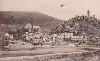 View from the Moselle's left bank of Beilstein and the Castle Metternich ruins