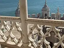 The tower has four storeys, with fenestrations and battlements, the ground floor being occupied by a vaulted cistern. On the first floor, there is a south-facing rectangular door with arched windows on the east and north, and bartizans in the northeast and northwest corners. The southern part of the second floor is dominated by a covered veranda with a loggia (matacães), consisting of an arcade of seven arches, resting on large corbels with balusters. It is covered by laced stonework to form a porch, and its sloped roof ends in a sculpted twisted rope.[5] The eastern, northern and western walls are occupied by double-arched enclosures, with the northeast and northwest corners occupied by statues of Saint Vincent of Saragossa and the archangel Michael in niches. The third floor has twin windows in the northern, eastern and western façades, with balusters, interspersed by two armillary spheres and large relief with the Royal coat of arms. The final floor is encircled by a terrace with shields of the Order of Christ, and a northern arched door and eastern arched window. The terrace is enclosed by a low wall with colonnaded pyramidal merlons with bartizans in the four corners. A similar terrace above this floor offers a view of the surrounding landscape.[26][27]