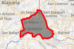 The compact canton is on the western side of the General Cañas Highway midway between the national capital city of San José and the Juan Santamaría International Airport.