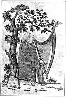 The 1792 Harpers's Festival had been organised, again, by members of the Belfast Society for Promoting Knowledge: James MacDonnell, Henry Joy, Robert Bradshaw and Robert Simms.[5] Encouraged by MacDonnell and supported by his adoptive family, McCrackens, the musician and collector Edward (Atty) Bunting notated the music of the ten performers.In 1808 he was appointed musical director of the new society, with Mary Ann McCracken acting informally as his secretary.[6] Bunting's master tutor was the most celebrated of the 1792 performers, Arthur O'Neill of Dungannon, now 75. O'Neill was to instruct poor children from the age of ten, blind like himself, with a view both to preserving his musical legacy and, as harpists, to save his charges from a life of destitution.