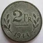 The 2 franc coin was minted by the United States in 1944 in preparation for the Allied liberation of Belgium. An Allied Occupation Issue, this coin was minted at the Philadelphia Mint with the blank planchets of the 1943 steel cent[10] Some of these coins have a slightly different weight, and thus their blank planchets would have been specifically made for this foreign denomination.