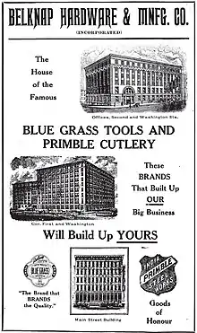 The company became one of the nation's largest wholesale enterprises with nationally known quality brands, among which Blue Grass was the most readily recognizable. John Primble knives, developed by an employee of the company, became a Belknap brand with its own division, made in Louisville between 1947 and 1985 by the John Primble Belknap Hardware Co.[10][11] The Crusader manufacturing brand of Belknap included contractors' shovels, hammers, hatchets, axes, drawing knives, carpenters' pincers, planes, screw drivers, hand drills, wrecking bars, bit braces, auger bits, chisels, pliers, wrenches, tin snips, and tin ceilings.[12][13] Other popular Belknap manufactured products included rifles, guns, padlocks, lawn mowers, and bicycles. Belknap inventory in the vast warehouse spaces grew larger and larger, and the Belknap neon sign could be seen from miles away.[14]