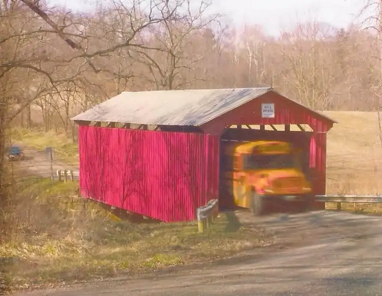 Located near the community of Barlow in Barlow Township, the bridge carries the gravel Bell Road over Falls Creek,[1]: 4 a southwestern tributary of Wolf Creek. Surrounded by woods,[2] the bridge lies adjacent to the farm once owned by the namesake Bell family, and the surrounding countryside is a mixture of forests and agricultural fields.[1]: 4 The builder was E.B. Henderson, who was responsible for four bridges in the area: the Blackwood Covered Bridge (1879), the Shinn Covered Bridge (1886), the Bell Covered Bridge (1888), and the Henry Covered Bridge (1894). Like two of the other three, the Bell is a multiple king post truss design, which became popular nationwide following its use on the National Road in a past version of the Y-bridge in Zanesville to the north.[1]: 3 An ordinary gable-roofed bridge with windows just below the roofline, the bridge spans 59 feet (18 m);[2] the deck is approximately 18 feet (5.5 m) wide, with 15 feet (4.6 m) of interior width, and the 11 feet (3.4 m) height permits slightly more than 9 feet (2.7 m) of interior clearance. It rests on abutments built of sandstone, quarried locally, while the roof is made of tin. The abutments are similar, with their faces underlying the bridge decks and wing walls to the side.[1]: 4