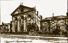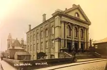 - Leighton Buzzard, Corn Exchange, Lake Road, 1862. According to Pevsner; "Victorian at its most irresponsible. Gay and vulgar, with two two-storeyed middle porch adorned with atlantes and caryatids. The style is a kind of dissolute Renaissance".[39] The Illustrated London News of 23 May 1863 described the Exchange as "a very handsome stone structure, situated in a commanding position, at one end of the market-place, with a good frontage. The Exchange-hall is spacious, and decorated with Ionic pilasters, cornice, and recessed, arched windows at the sides; the ceiling is formed into sunk coffers by enriched stiles, supported by coved ribs...... The design throughout is chaste and original, the front being designed in the modern Italian style of architecture, and consists of two stories of three light Venetian windows." The cost of site and buildings was about £7500. It later was used as a cinema, and in 1932 the spire above the portico became unsafe and was taken down.[40] The Exchange was demolished c.1960.