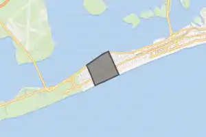 Belle Harbor is a suburban enclave on the Rockaway Peninsula, on a narrow barrier peninsula sandwiched between the Atlantic Ocean to the south and Jamaica Bay to the north. It is also bordered by the neighborhood of Neponsit to the west and Rockaway Park to the east. Its broad, white sandy beaches draw residents and visitors to the area. As part of the New York City parks system, Rockaway Beach is open to the public. The beaches in Belle Harbor draw many down-for-the-day visitors (DFDs) during the week. Street parking is prohibited on weekends and holidays from May 15 to September 30. Visitors must use buses, bicycles or the ferry/shuttle service to access the neighborhood beaches during those times.[17] The bike lanes on Rockaway Beach Blvd. connect to both the Rockaway and Riis Park boardwalks and are part of the Jamaica Bay Greenway Bike Path.[18]