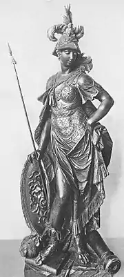 The use of Bellona in such structures was well established before this, dating back to her prominent use in Jean Cosyn's doorway. The Temple of Bellona, designed by William Chambers for Kew Gardens in 1760, was projected as a celebration of the Anglo-Hanoverian war effort during the Seven Years' War and eventually housed plaques honouring the regiments that served in it.[38] These, however, related primarily to remembrance of victory rather than of the fallen. It was not until a century afterward that the French-Canadian victims of the Seven Years War were commemorated by a monument at Quebec. Atop a tall column on the site of the battlefield, Bellona looks down, carrying a shield and laurel crown in her right hand.[39] The statue was presented by Jérôme-Napoléon in 1862 as a gesture of reconciliation.[40]