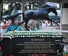 Secretariat's finishing time in his 1973 Belmont victory (2 minutes, 24 seconds) set a world record for 1+1⁄2 miles (2.4 km) on dirt,[17] a world record which still stands. The 31-length victory clinched the first Triple Crown in 25 years, dating back to Citation in 1948. A statue of Secretariat is in the center of the Belmont paddock.