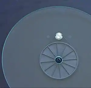 The three-point "suspended sub-chassis" was a design by renowned audio pioneer Edgar Villchur. It became the basis upon which his company created the Acoustic Research XA turntable that was launched in 1961.[1] The principle behind it is that the turntable is an inert platform that allows the stylus to track the surface of the record accurately whilst being protected from external vibrations. The platter, sub-chassis, armboard and tonearm mechanically form a closed loop, and sit on top of dampers (usually three springs) which isolate the sub-assembly from its motor and its base. The motor, mounted (directly or indirectly) on the top plate, drives the turntable platter via a belt. The compression spring system of the XA was much improved upon, and popularised in the Linn Sondek LP12.[1] A variation can be found in the Oracle Delphi, where the spring is extended;[2] another variant is the Roksan Xerxes, whose top plate is isolated from the motor bearing assembly by compliant rubber dampers.[3]