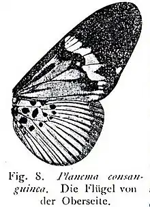P. consanguinea differs from the preceding [Bematistes elongata ]in having the basal part of the forewing above more or less light and the light transverse band more obliquely placed, narrowed or indistinct behind vein 2 and separated from the light basal part by a dark transverse band of the ground-colour, while the upperside of the hindwing is not darkened at the base. The black streaks on the hindwing are long and reach at least the middle. The marginal band on the upperside of the hindwing is sharply defined and is formed nearly as in elongata. - consanguinea Auriv. (58 b). The basal part of the forewing above as far as vein 3 chestnut-brown with or without longitudinal streak in the cell; the transverse band and the upper surface of the hindwing yellow- brown; the under surface of the hindwing yellowish grey, at the base more or less red-brown. The female is larger and lighter and has the transverse band of the forewing broader and light yellow. Niger to the Congo, ab. intermedia Auriv. only differs in having the whole of the cell of the forewing black. Congo. - sartina Jord. seems to be the north-western race. Only the female is yet known; it differs from that of the type-form in having the transverse band of the forewing as dark as in the male and placed nearer to the base, the marginal band of the hindwing is broader and the ground-colour lighter; on the under surface the base is darker brown and the ground-colour lighter. Gold Coast. - In albicolor Karsch (= arenaria E. Sharpe) (57 e, 58 b) the transverse band of the forewing is white and the parts of the upper surface which in the type-form are red-brown to yellow-brown are dirty sand-yellow (male) or white (female); the under surface of the hindwing is light grey to white as far as the base. Uganda. [4]