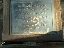 There is a plaque on the roadside, close to Escort Rock, where Frank Gardiner's gang (including Hall), robbed the gold escort on 15 June 1862. The plaque was erected to mark the centenary of the robbery.[14]
