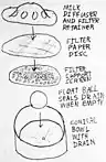 Following milking each cow, the bucket milker would be dumped into the receiver cart. A foot pedal on the base of the cart lifted the cover, which kept contaminating dust and debris out of the cart, and allowed the farmer to hold the heavy bucket milker with both hands while pouring. A diffuser plate in the top of the cart prevented milk from splashing out while rapidly pouring the milk, and a large filter disk under the diffuser removed any debris from the milk.