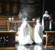 The actual benediction or blessing follows exposition of the Blessed Sacrament, i.e., the placing of the consecrated Host in a monstrance set upon the altar or at least exposition of a ciborium containing the Blessed Sacrament.[4] Thus "the blessing with the Eucharist is preceded by a reasonable time for readings of the word of God, songs, prayers, and a period for silent prayer", while "exposition merely for the purpose of giving benediction is prohibited".[5]