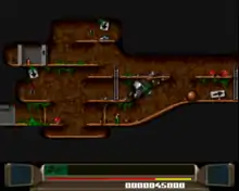 There are three difficulty levels: easy, normal and hard. On easy, enemies do less damage. On hard enemies do more damage and any damage taken is carried over to the next level. Score is gained by picking up bonus items and at the end of each level score is awarded based on how much health the player has got left.