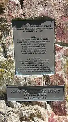 Beniamino "Benny" Bufano (October 15, 1890 – August 18, 1970) was an Italian American sculptor, best known for his large-scale monuments representing peace and his modernist work often featured smoothly rounded animals and relatively simple shapes. He worked in ceramics, stone, stainless steel, and mosaic, and sometimes combined two or more of these media and some of his works are cast stone replicas. He had a variety of names used, and sometimes went by the name Benvenuto Bufano because he admired Benvenuto Cellini. His youthful nickname was "Bene," which was often anglicized into "Benny." He lived in Northern California for much of his career.