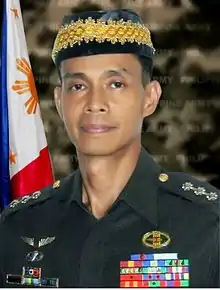 Later, he led the 58th Infantry (Dimalulupig) Battalion[10] under the 4th Infantry Division in Mindanao at the height of the Moro Islamic Liberation Front (MILF) hostilities in 2000 and was awarded the Gold Cross Medal for gallantry in action. At that time, he was conferred the Maranao honorary title of Sultan a Romapunut sa Lumbayanague in Lanao del Sur by the Muslims in the area for his peace efforts.[3] [11]