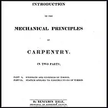 In 1822 Robert Hallowell Gardiner offered Hale a position to become the principal and first main instructor of the first vocational trade school in the United States, a new school in Gardiner, Maine.[10] It was a trade school for the education of farmers and agronomists. Hale accepted the position and delivered an address on the opening of the Gardiner Lyceum on January 1, 1823.[10] Hale established this as the first vocational trade school in America through his curriculum.[6][11][12][13] He had twenty students at the beginning.[8] He organized courses into agricultural chemistry, mathematics, natural philosophy, navigation, surveying, and architecture (using his book Mechanical Principles of Carpentry).[10] Hale also had various courses in husbandry in the winter months.[8]
