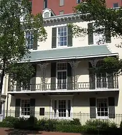 As originally built, the Federal-style[8] house had three stories.[9] The completed house had four or five parlors.[10] It was built of unpainted, cream-colored brick.[11] The entrance was level with the ground, with an oriel window above it on the second floor and a Palladian window on the third floor above that.[12] An oval portico protected visitors arriving at the front doors.[11]