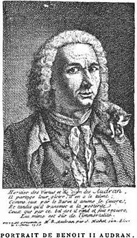 Benoït Audran, called the Younger, to distinguish him from his uncle, was a French artist born in Paris in 1698, and died there in 1772. He was the son and pupil of Jean Audran, and engraved in the same manner as his father. He engraved prints after Paolo Veronese, Poussin, Natoire, Lancret, Watteau, and other French artists.