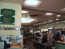 The interior was seemingly unchanged through the years. Its columns and walls were painted in bright greens and yellows with chrome siding, it had a stainless steel edged counter with rows of chrome counter stools, and terrazzo floors, laminate wall covering, and a ceiling with indirect lighting coves.[1] The chairs were bright yellow, orange and green. Walls were covered in photographs of celebrities who had dined at the restaurant; one spot was dubbed "Bens Wall of Fame". Bens employed only waiters, who wore a black bow tie and white buttoned shirt with black dress pants and shoes, along with a white waist apron.