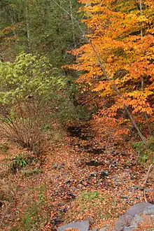Near the culvert, Benson Hollow has a streambed made of gravel with an average grain size of 45 millimeters (1.8 in). The stream is a Rosgen C Type stream and does not have large loads of debris.[6] The surficial geology along the lower reaches of the stream, but alluvium and a lake occur in the upper reaches. The stream's valley is flanked by Wisconsinan Till and bedrock consisting of sandstone and shale.[5]