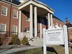 Benton Hall, built in 1907~1908 as an administration building, dedicated in 1909, was used as such until the new Administration Building was completed in 1956.[1] It housed the music department, and the auditorium seating 1200 was used for small group meetings as it can accommodate only a fraction of the present enrollment, and total Miami meeting. Currently, Hall Auditorium houses the College of Engineering and Computing office as well as the Computer Science and Software Engineering department.[2]