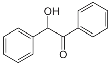 Benzoin (/ˈbɛnzoʊ.ɪn/ or /-ɔɪn/) is an organic compound with the formula PhCH(OH)C(O)Ph. It is a hydroxy ketone attached to two phenyl groups. It appears as off-white crystals, with a light camphor-like odor. Benzoin is synthesized from benzaldehyde in the benzoin condensation. It is chiral and it exists as a pair of enantiomers: (R)-benzoin and (S)-benzoin.