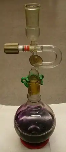 Generally sodium is used as the alkali metal. Although inferior in terms of safety and effectiveness relative to molecular sieves,[14] this ketyl is used in the purification of organic solvents, particularly ethers, because it reacts with water and oxygen to give non-volatile products.[15][16] The ketyl is soluble in the organic solvent being dried, so it accelerates the reaction of the sodium with water and oxygen. In comparison, sodium is insoluble, and its heterogeneous reaction is much slower. When excess alkali metal is present a second reduction may occur, resulting in a color transformation from deep blue to purple:[13]