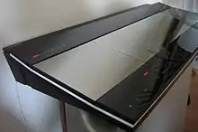 The BeoCenter 9500 is an integrated home music system by Bang & Olufsen. It consists of an AM/FM receiver, CD player and cassette recorder. Its features a mirrored exterior of polished aluminium and smoked glass. The BeoCenter 9500 has no buttons: it is controlled by touching the glass with a fingertip.