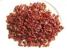 The South Khorasan province in Iran is the main area of zerešk and saffron production in the world, especially around Birjand and Qaen. About 85% of production is in Qaen and about 15% in Birjand. There is evidence of cultivation of seedless barberry in South Khorasan two hundred years ago.[8] A garden of zerešk is called زرشکستان zerešk-estân. Zerešk is widely used in cooking, imparting a tart flavor to chicken dishes. It is usually cooked with rice, called زرشک پلو zerešk polo, and provides a nice meal with chicken.