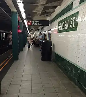 Both platforms on the upper level have a dark green trim line on a lime green border which was installed during the 1990s renovations.[26] New tiles replaced the original small "BERGEN" tiles, and covered existing advertisement panels. The only uncovered original tiles are the mosaic name tablets reading "BERGEN ST." in white sans-serif lettering on a dark green background and green border. Dark green I-beam columns run along the entire length of both platforms at regular intervals with alternating ones having the standard black station name plate with white lettering.[27]