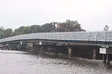 A temporary one-lane bridge was provided during construction to the south of the permanent bridge site. The temporary bridge had improved weight capacity, allowing emergency vehicles to use it.[3] This bridge opened on August 16, 2010.[5] The structure was a 3rd generation Bailey bridge.[5][6] Once the main bridge opened, the temporary bridge was removed.