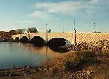 The current bridge is a fixed structure, consisting of four pre-cast arch spans with closed spandrel walls of cast-in-place concrete, with approximately the same footprint as the previous bridge, using pile-supported abutments and piers. The finished bridge was made such that it appears to be constructed of stone masonry rather than concrete. The two end spans are 74 feet (23 m) and the two center spans are 92 feet (28 m) for a total bridge length of approximately 350 feet (110 m).[3][4] In Fall 2014, the arches were built from segments trucked in. The arches are ten segment widths wide and were brought in as half-arches.