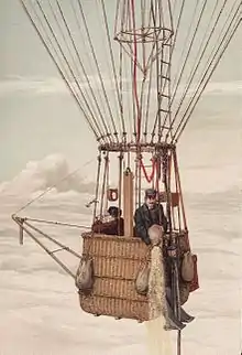 The first balloon flight with the aim of making meteorological observations was undertaken on 30 November 1784 by the American medical doctor John Jeffries together with the professional balloonist Jean-Pierre Blanchard.[5] Some of the first systematic investigations into the upper atmosphere was performed between 1862 and 1866 by the English meteorologist and important pioneer aerologist James Glaisher. On 28 balloon flights, he measured the temperature, air pressure, humidity and the wind speed up to an altitude of almost 9000 meters.[6][7] As his instruments were not sufficiently protected from solar radiation, and as he placed them inside the basket, his temperature measurements were particularly high and affected by errors. In the following years, most scientific balloon flights were made by French scientists such as Camille Flammarion, Gaston Tissandier and Wilfrid de Fonvielle. However, the investigation of the upper atmosphere remained isolated endeavors of individual researchers until the 1890s.[8]