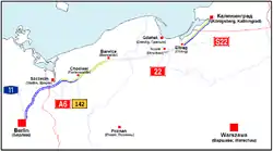 With the end of the Cold War, and particularly with Poland joining the European Union, increasing thought has been given to reconstructing the road as part of the European highway system. In the 1990s, a 14 kilometre (8.7 mile) long segment near the western Polish border was incorporated into the new A6 Autostrada (highway). A further 7 kilometres (4.3 miles), to the junction with National Road 10, was being restored and was scheduled to open for traffic in August 2007. An additional 8 kilometres (5.0 miles) is to be upgraded at some future date and redesignated as part of the A6. The section between Elbląg and the border with Russia was completely reconstructed and opened as an express road, S22, in September 2008. In the course of the upgrade, the new modern carriageway was built in the space left for the second carriageway during original construction. At the same time, the original concrete carriageway was demolished almost along the entire length of the route, and only a few traces of it remain. All of the remaining original overpasses and bridges were demolished and replaced with modern works. Thus very few traces of the original German autobahn can be seen. Other part of the Berlinka are incorporated into voivodeship road 142, and expressroad 6/3. In the Russian Kaliningrad Oblast, it is incorporated into road P516.
