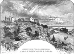 Maguire became the president of Georgetown University for a second time on January 1, 1866.[19] Replacing John Early,[20] he took office in the aftermath of the American Civil War. Enrollment at the university had declined precipitously during the war, and few students remained by the time Maguire took office.[17] From 1859 to 1861, the number of students dropped from 313 to 17.[21] As a result of the decreased enrollment, the university was left in a precarious financial state. By the end of Maguire's term, the number of students had begun to rebound.[22] Georgetown's physical campus also suffered during the war, which Maguire described as being "nearly ruined."[21] Upon the end of the 1866 academic year in July, he immediately began to repair and expand the buildings that were damaged from being used as barracks and a military hospital by the Union Army.[21] Within three months, the work was complete.[23] To symbolize post-war national unity, Maguire adopted the respective colors of the Union and Confederate Armies, blue and gray, as the school's official colors.[21]