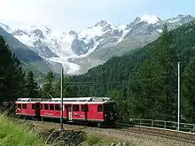 ![]() Two Rhaetian Railway ABe 4/4 III multiple units with a Bernina Express train on the Bernina Railway, passing Lago Bianco | |