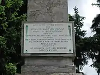 The Neoclassical memorial is executed in Norwegian marble and stands on a granite plinth. It features reliefs representing the harvest and a plaque inscription: