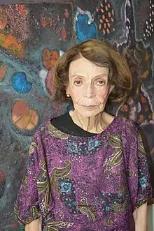 ![]() Taracena in front of "Señoritas de Tecuala" by Vlady at her home in Mexico City | |