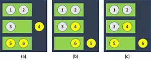 Bertrand's box paradox: the three equally probable outcomes after the first gold coin draw. The probability of drawing another gold coin from the same box is 0 in (a), and 1 in (b) and (c). Thus, the overall probability of drawing a gold coin in the second draw is 0/3 + 1/3 + 1/3 = 2/3.