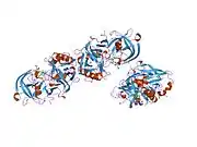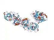 BACE1 is an aspartic acid protease important in the formation of myelin sheaths in peripheral nerve cells: in mice the expression of BACE1 is high in the postnatal stages, when myelination occurs.[6] The transmembrane protein contains two active site aspartate residues in its extracellular protein domain and may function as a dimer, its cytoplasmic tail is required for the correct maturation and an efficient intracellular trafficking, but doesn't affect the activity. It is produced as a pro-enzyme, the endoproteolitc removal occurs after BACE leaves Endoplasmic reticulum, in the Golgi apparatus. In addition the pro-peptide receives additional sugars to increase the molecular mass.[7] and the tail became a palmitoylated.