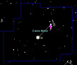 Beta Canis Minoris (β Canis Minoris, abbreviated Beta CMi, β CMi), also named Gomeisa /ɡɒˈmaɪzə/,[12][13] is a star in the constellation of Canis Minor. In the night sky it is notable for its proximity to the prominent star Procyon.
