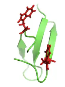 Proteins that are β-sheet rich, also called WW domains, function by adhering to proline-rich and/or phosphorylated peptides to mediate protein–protein interactions. The "WW" refers to two tryptophan (W) residues that are conserved within the sequence and aid in the folding of the β-sheets to produce a small hydrophobic core.[5] These tryptophan residues can be seen below (right) in red.